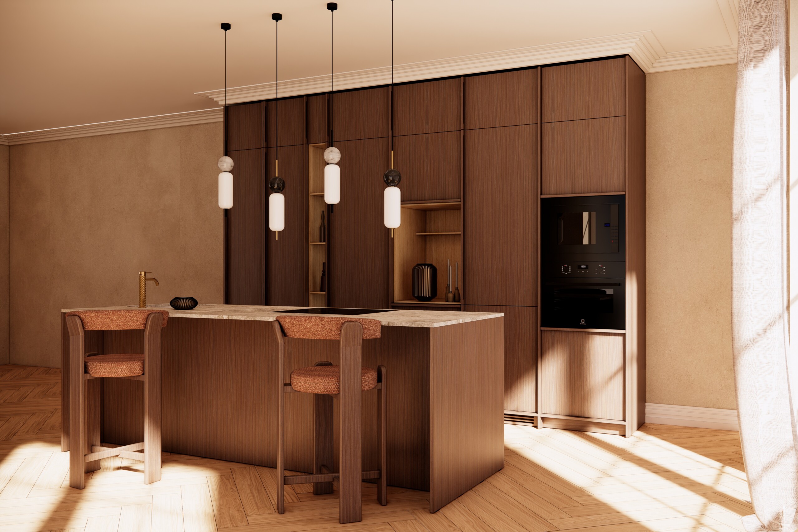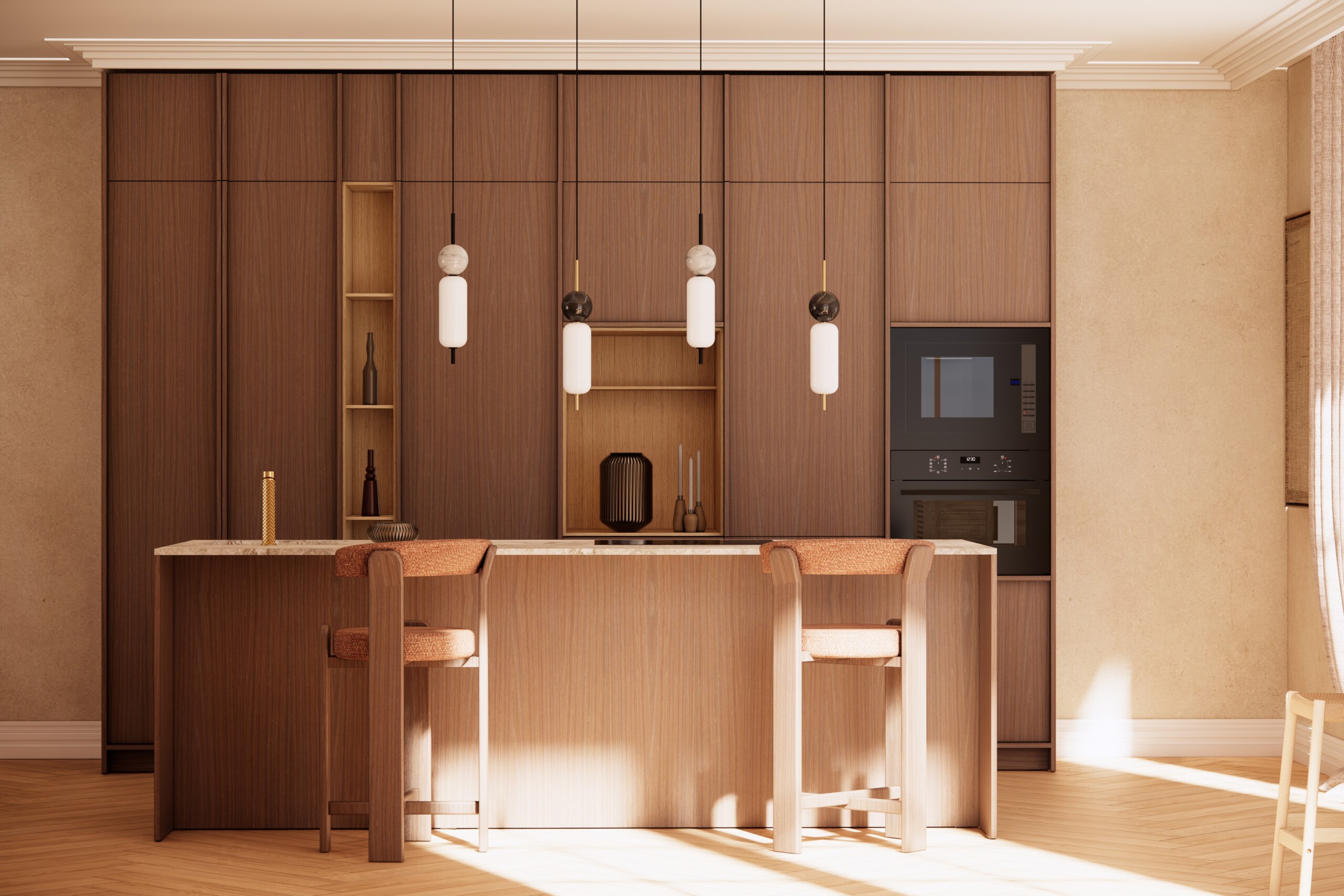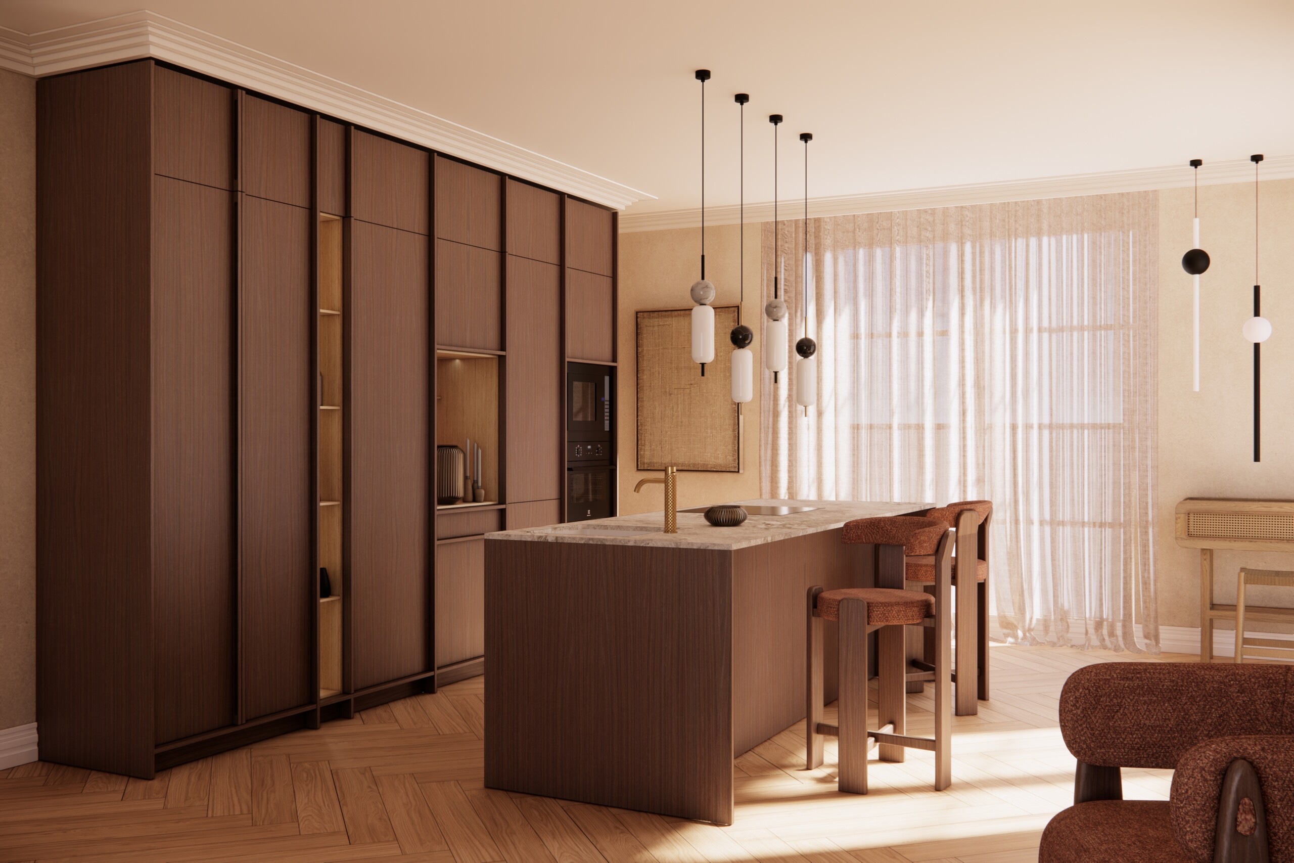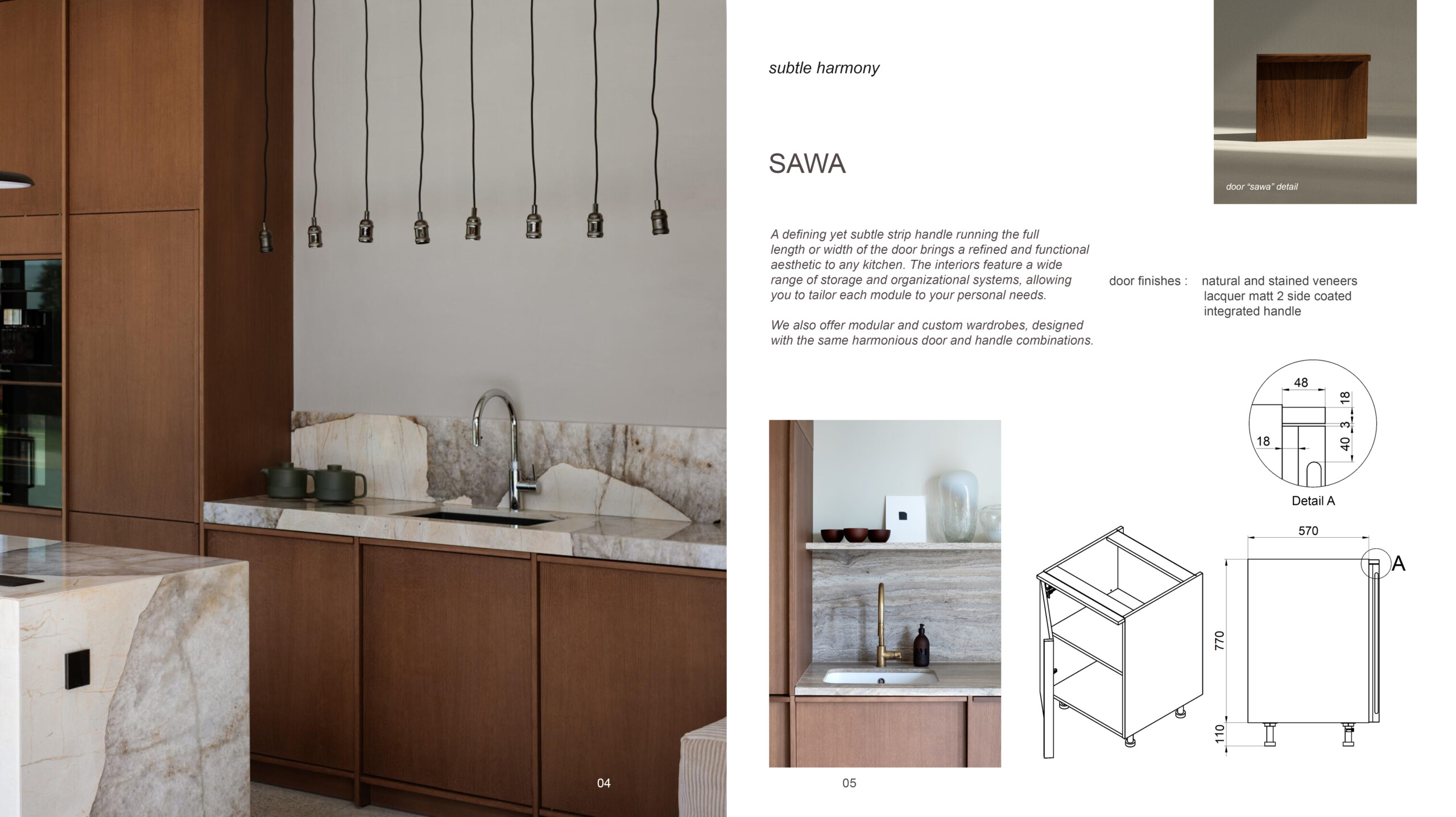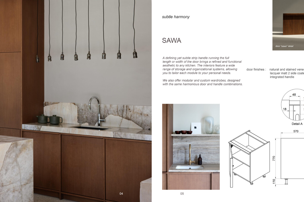 Sawa is a modern kitchen that fits perfectly into open living spaces. This model is made of stained oak veneer and solid wood. The vertical and horizontal elements hide a subtle handle groove that gives this composition a unique character. This model is made with the utmost attention to technical and aesthetic details. Self-closing fittings and drawers , as well as possibility of using many storage systems that facilitate work in kitchen will meet the requirements of true enthusiasts of the art of cooking.