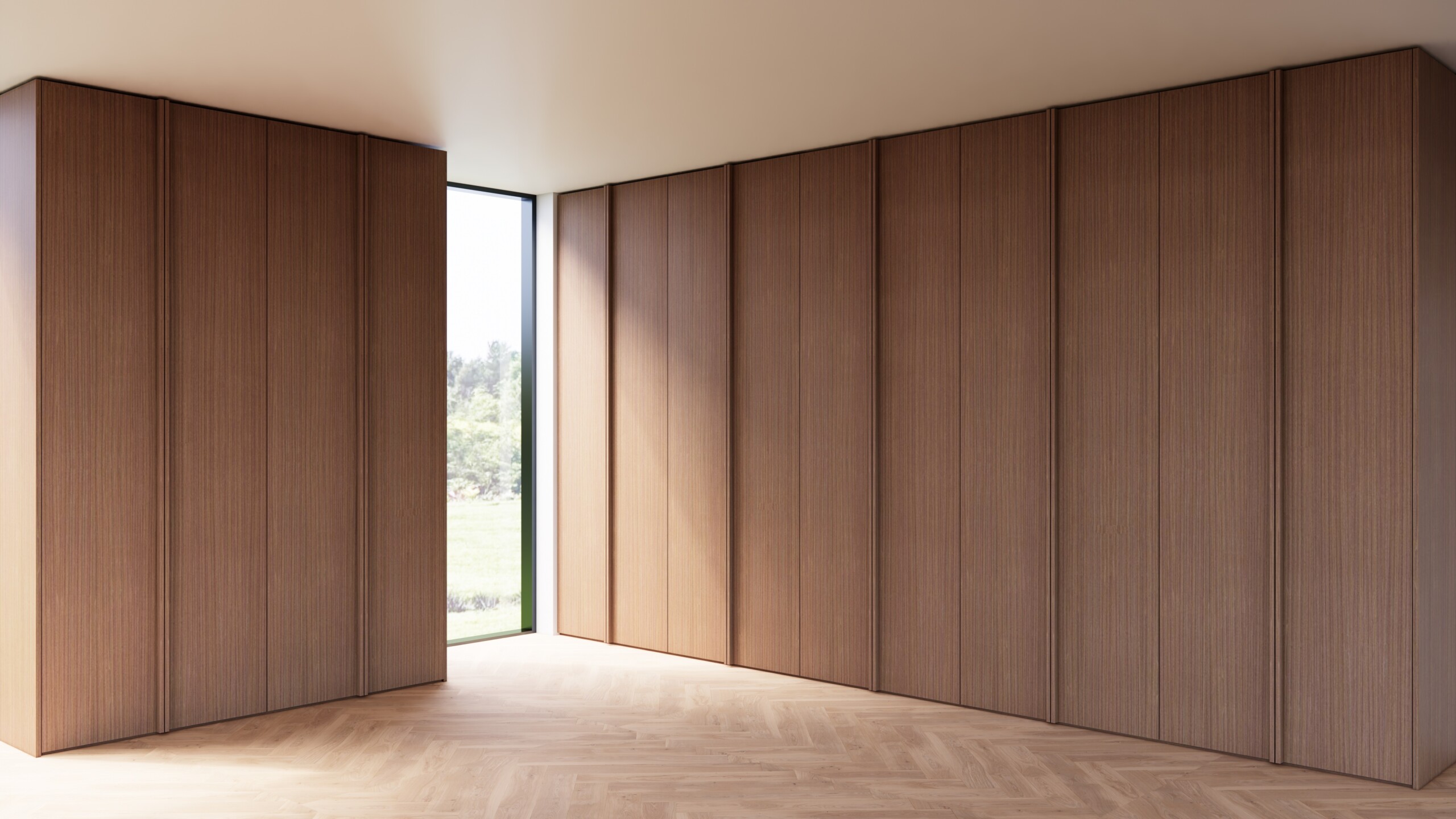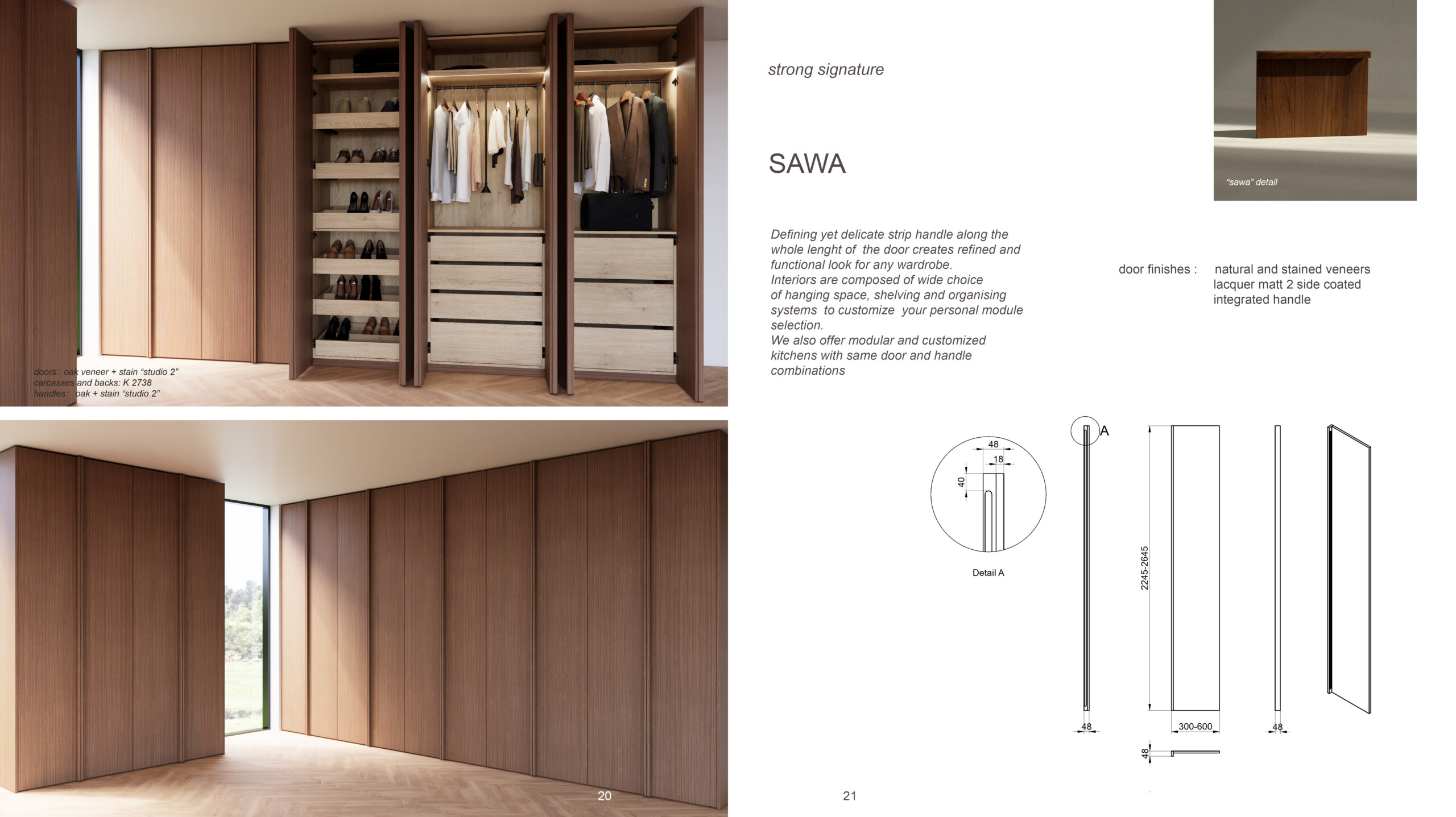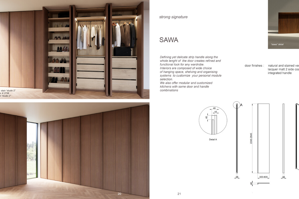 Defining yet delicate strip handle along the whole lenght of the door creates refined and functional look for any wardrobe. Interiors are composed of wide choice of hanging space, shelving and organising systems to customize your personal module selection. We also offer modular and customized kitchens with same door and handle combinations.