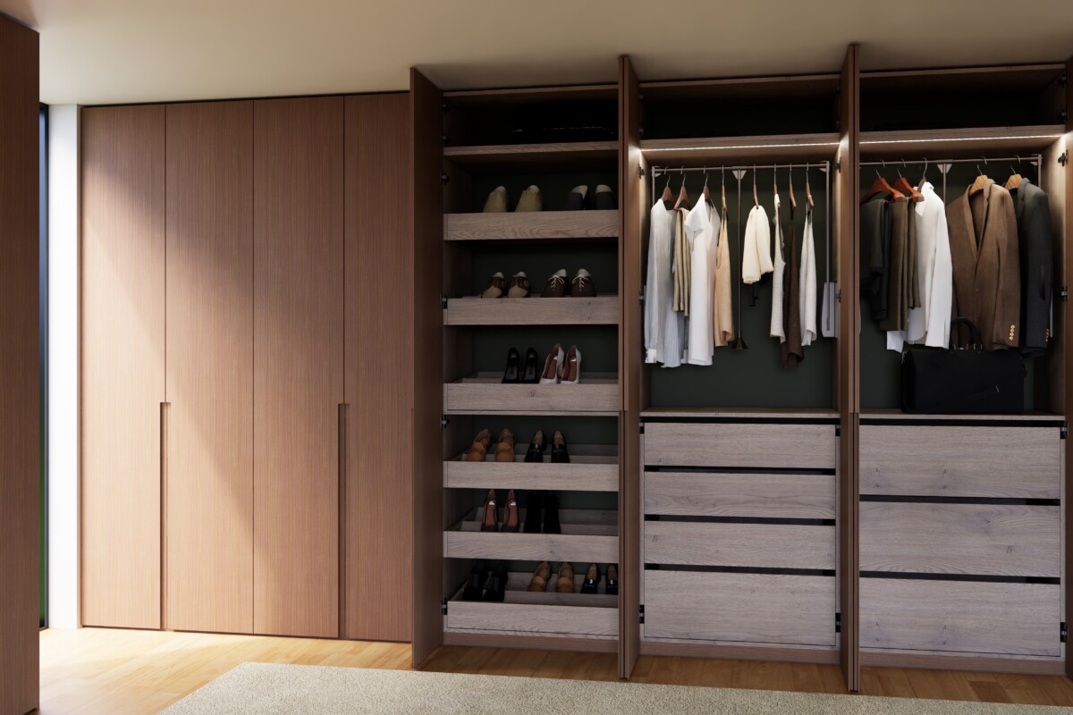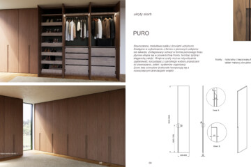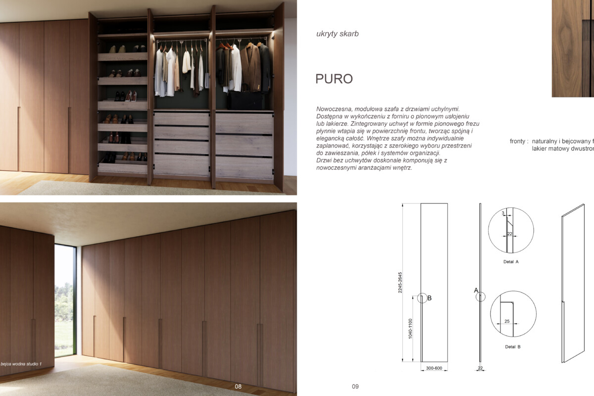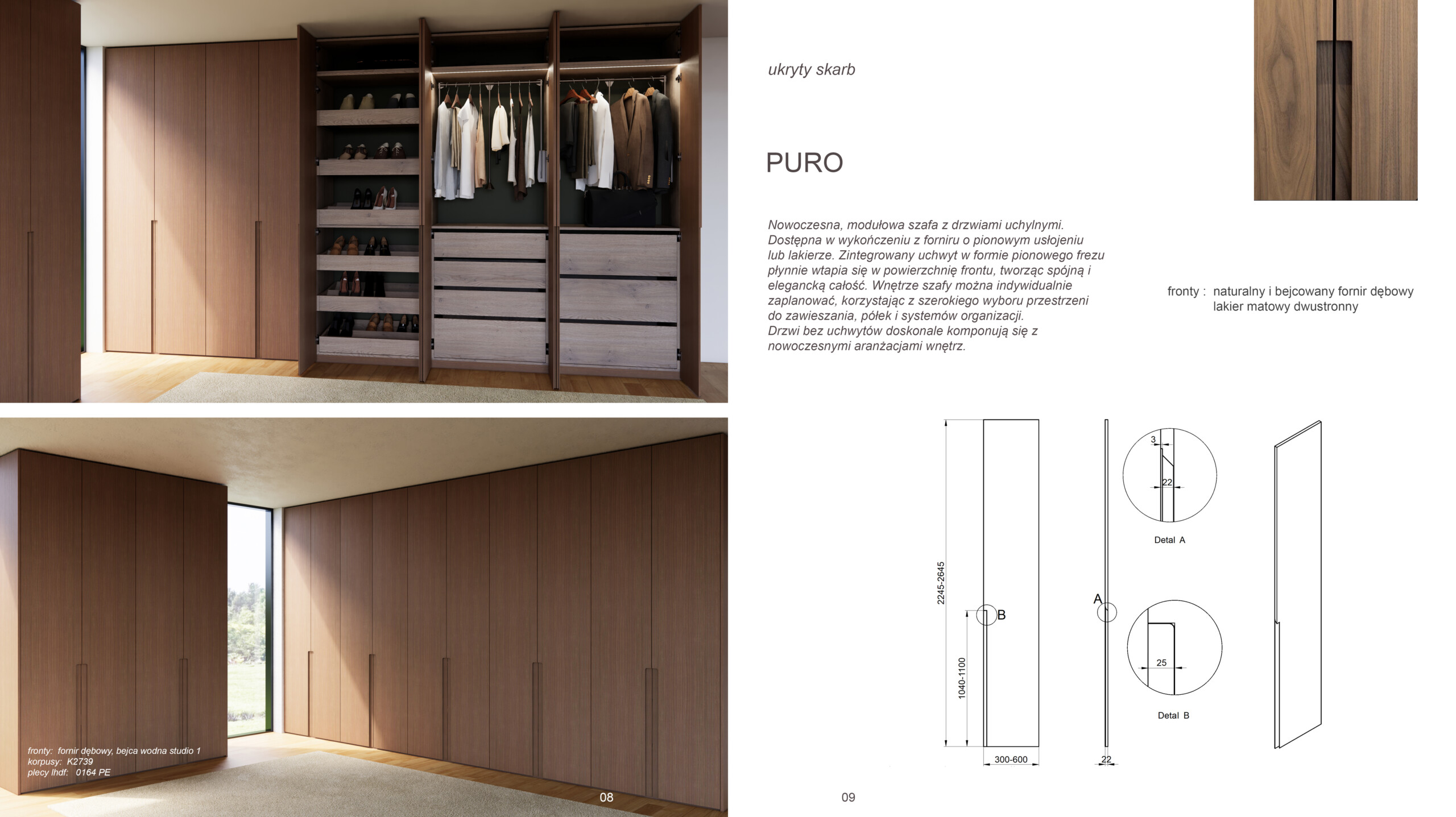 Nowoczesna, modułowa szafa z drzwiami uchylnymi. Dostępna w wykończeniu z forniru o pionowym usłojeniu lub lakierze matowym. Zintegrowany uchwyt w formie pionowego frezu płynnie wtapia się w powierzchnię frontu tworząc spójną i elegancką całość. Wnętrze szafy można indywidualnie zaplanować korzystając z szerokiego wachlarza przestrzeni do zawieszania, półek i systemów organizacji. Drzwi bez uchwytu doskonale komponują się z nowoczesnymi aranżacjami wnętrz.