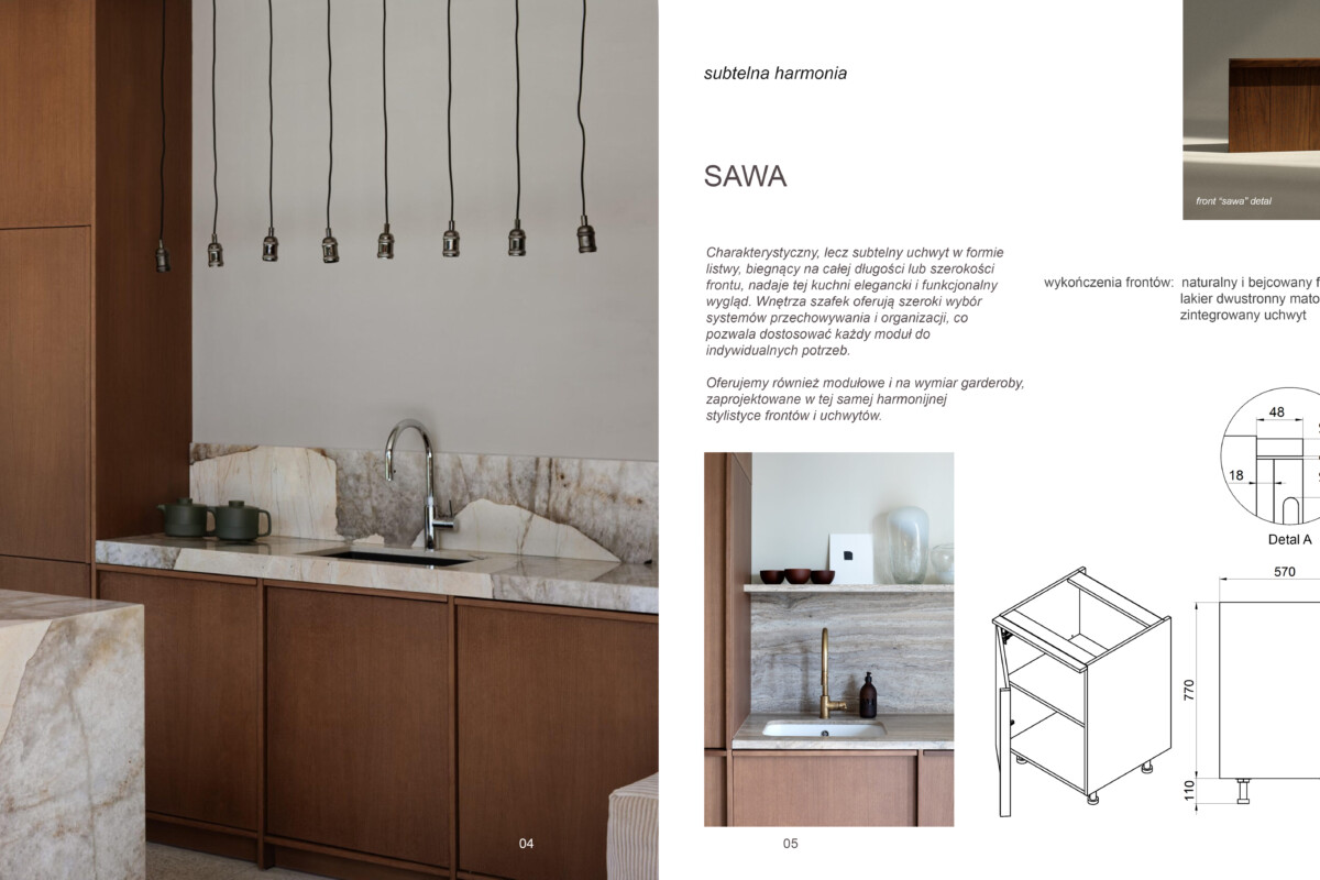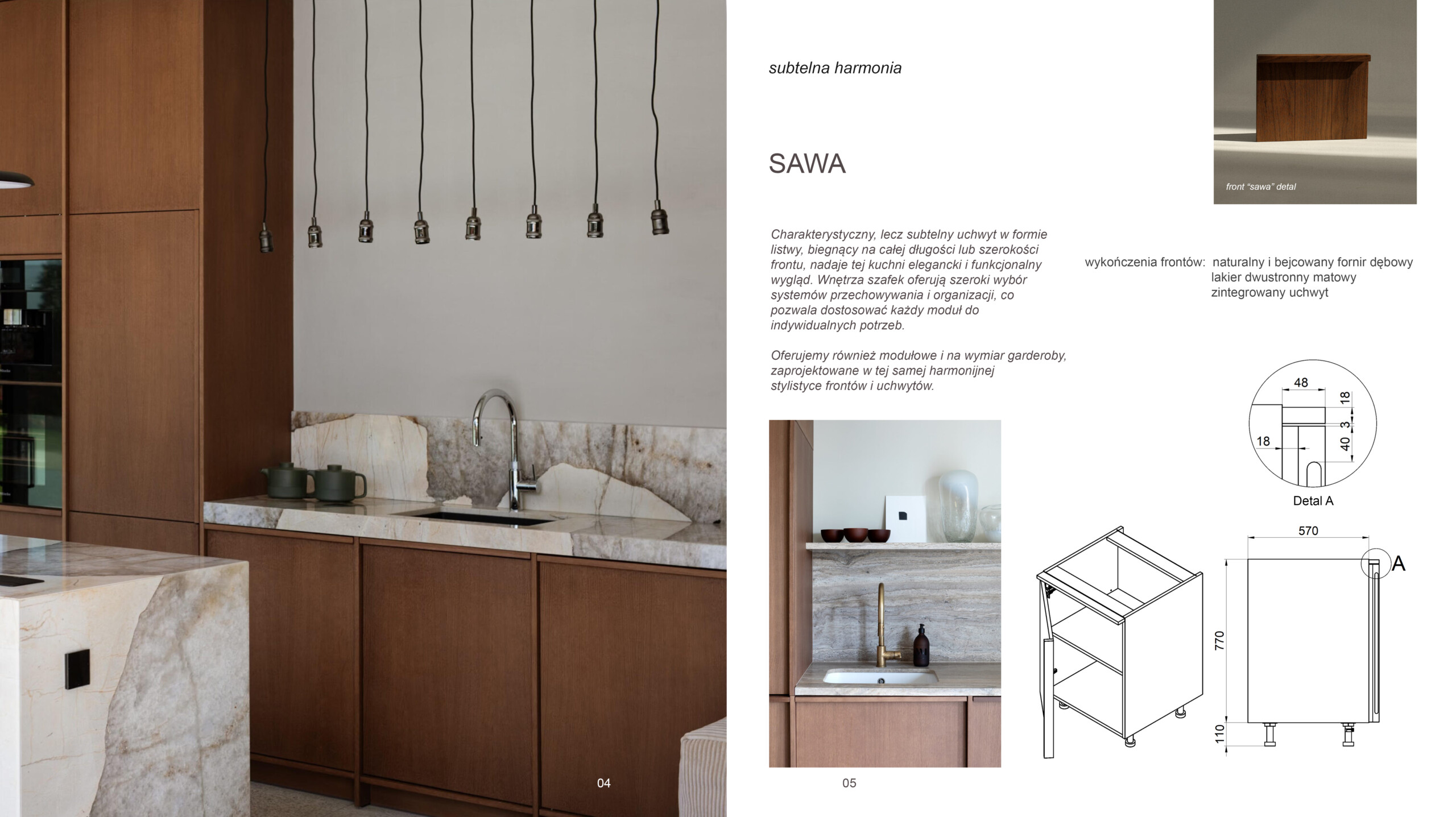 Sawa to nowoczesna kuchnia, która znakomicie wpasowuje się w otwarte przestrzenie mieszkalne. Zabudowa wykonana jest z barwionego dębowego forniru oraz litego drewna. W pionowych i poziomych podziałach kryje się subtelny frez uchwytowy, który nadaje wyjątkowy charakter kompozycji. Model ten jest wykonany z najwyższą dbałoscią o detale techniczne i estetyczne. Samodomykające się okucia i szuflady oraz możliwość wykorzystania wielu systemów ulatwiających pracę w kuchni pozwoli spełnić wymagania prawdziwych pasjonatów sztuki gotowania.