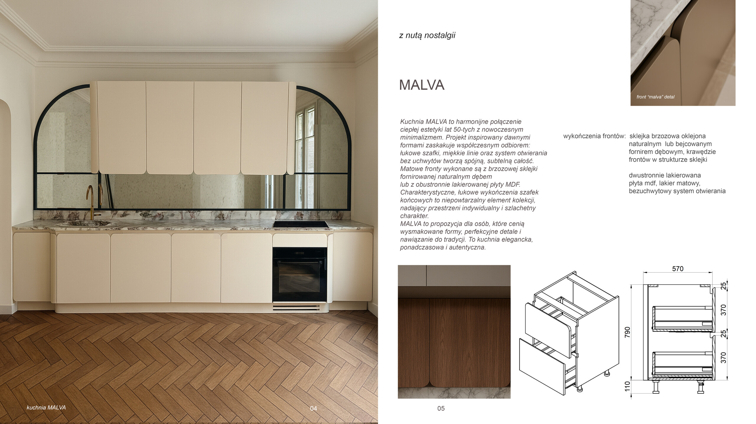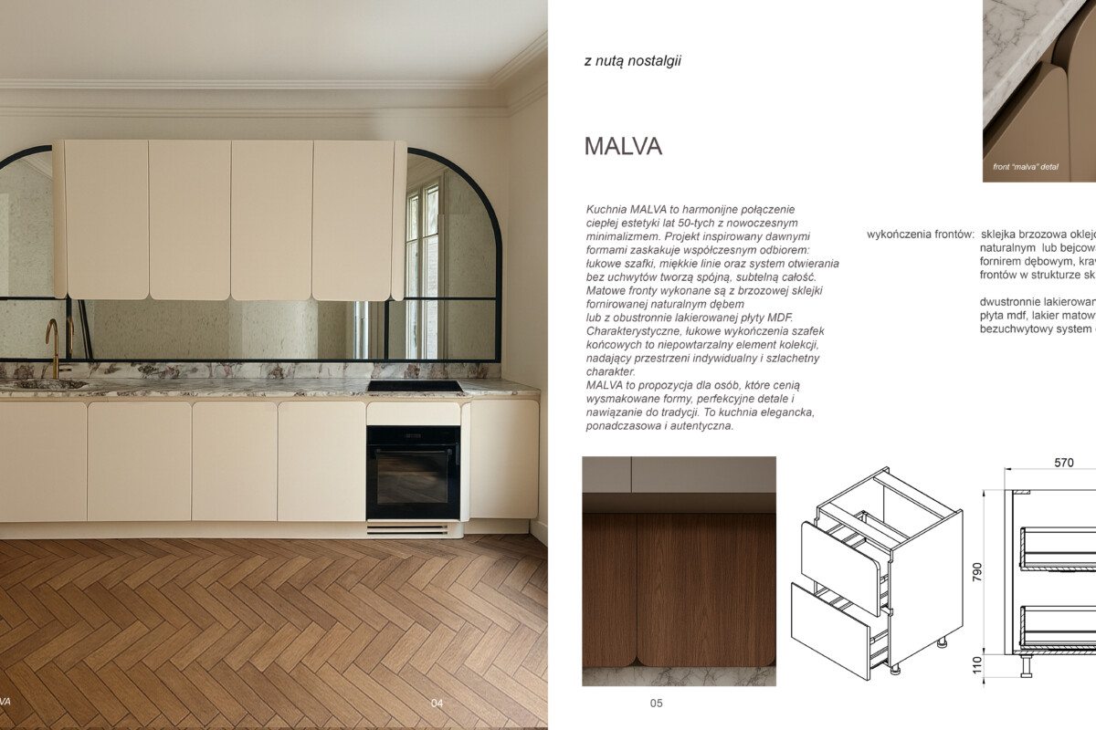 Kuchnia Malva to wyjątkowe połączenie nostalgii z nowoczesnością. Projekt czerpie z dawnych estetyk nawiązując do lat 50-tyvh, ale całość idealnie komponuje się ze współczesnym designem proponując łukowe szafki i elementy, bezuchwytowy system otwierania z zaokrąglonymi liniami, matowym wykończeniem i szlachetną gamą kolorów. Malva to wybór dla miłośników nowoczesnego minimalizmu z odrobiną nostalgii, dla osób ceniących rzemieślnicze detale i perfekcyjne wykończenia.
